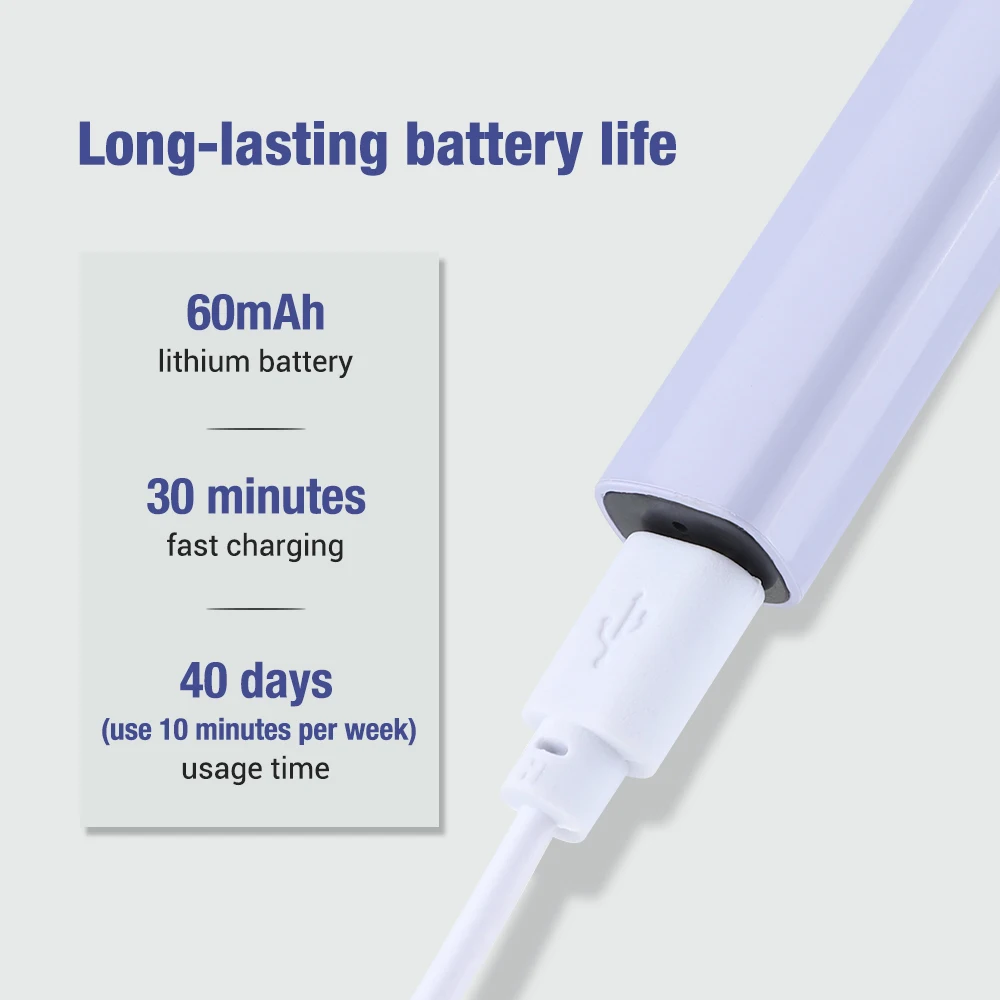 4.Built-in 60mAh lithium battery, fast charging in 30 minutes, 10 minutes of use per week, battery life up to 40 days.
